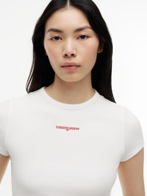 Bring a '90s vibe to outfits with this ribbed stretch cotton tee, cut in a slim fit showcasing serif script logo embroidery.