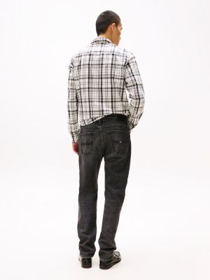 Faded detailing and a washed-out rinse give these black jeans a worn look, complemented by a slim fit and straight-leg cut.