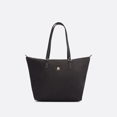 This tote bag captures an understated aesthetic, defined by its smooth nylon fabric featuring a refined, subtle sheen. Its generous capacity easily fits your daily essentials, whether that's a laptop, study books or gym gear. Durable straps are comfortable on your shoulders, arms and hands, adapting seamlessly to the flow of your day. A zipped closure helps to keep belongings safe and secure, giving you peace of mind when you're moving through busy spaces. Check out the signature TH monogram plaque on the front, which lends it a luxurious touch without overwhelming the overall look. Designed for durability and style, it's a sophisticated addition to your city edit.