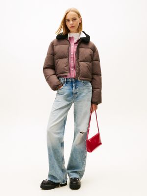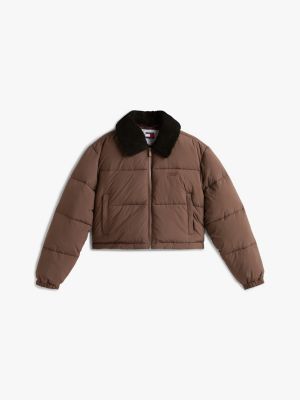 This regular-fit puffer jacket adds a textured touch to laid-back outfits with its detachable teddy fleece collar and crinkle nylon finish.
