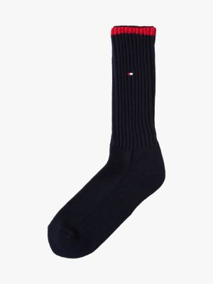These boot socks are woven in a chunky rib-knit from stretch cotton blend yarn, with a contrast stripe highlighting the cuff.
