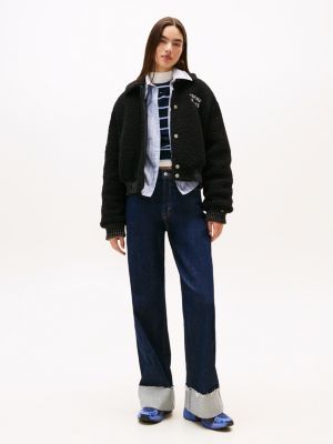 Get prepped for the cooler weather with this snug teddy bomber jacket, featuring a collegiate-inspired design and an easy button closure.