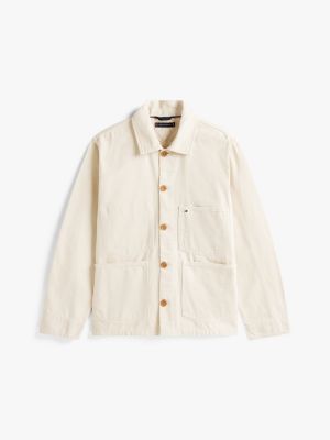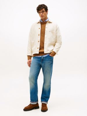This chore jacket is crafted from rigid cotton denim and is garment dyed for a lived-in look, making it a stylish layer.
