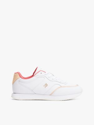Step out in style with the latest women's trainers from Tommy Hilfiger. Discover sneakers that effortlessly combine off-duty appeal with our iconic signature style. Elevate your casual-chic ensemble by choosing platform women’s trainers, adding a fashionable edge to your outfit. Make a bold statement with the chunky trainer trend, pairing them with a logo t-shirt and high-rise jeans for a fashion-forward look. Seamlessly transition from work to play by incorporating smart heeled women's trainers into your office attire; opt for classic white women’s court trainers with tailored trousers or a midi dress for a polished yet comfortable appearance. For extra warmth, choose stylish insulated sneakers that provide both warmth and fashion flair. When summer arrives, opt for breathable, lightweight sneakers in vibrant colours to keep your style fresh and breezy. Whatever the season, keep your trainers looking spick and span with our video tutorial on how to clean your leather trainers. Embrace the signature East Coast cool and step out in style with Tommy Hilfiger's women's sneakers.